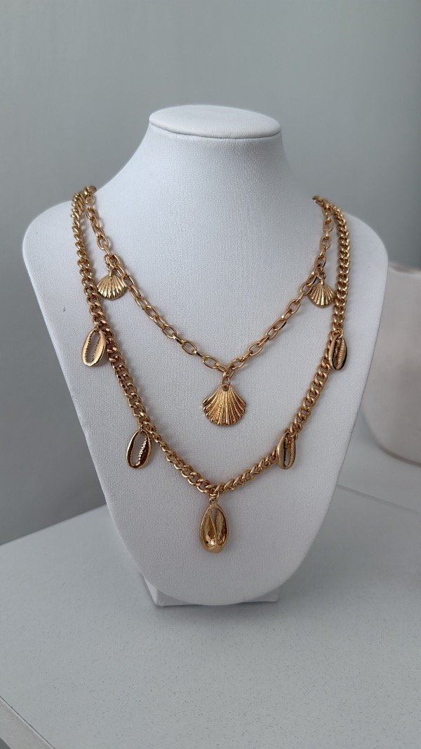 Cadena doble dijes ostras y caracoles 40 a 45cm ACERO GOLD